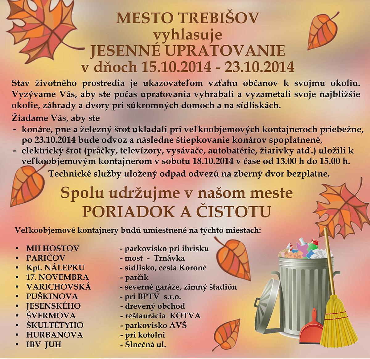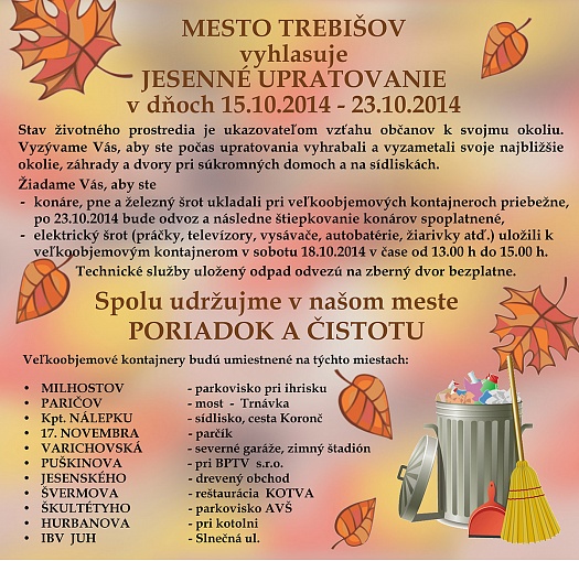 MESTO TREBIŠOV vyhlasuje jesenné upratovanie v dňoch 15.10.2014 - 23.10.2014.