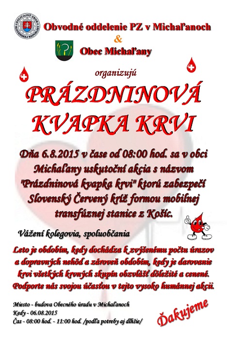Štvrtok 6. augusta 2015 organizuje Obvodné oddelenie PZ v Michaľanoch a obec Michaľany „Prázdninovú kvapku krvi“. Akciu zabezpečí Slovenský Červený kríž formou mobilnej transfúznej stanice z Košíc.