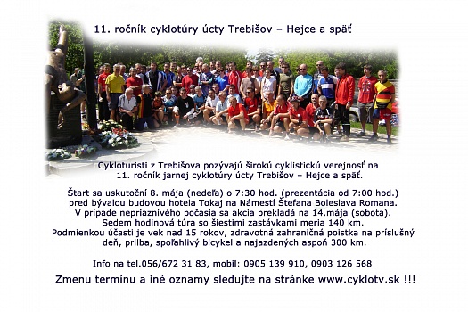 Trebišovský cykloturistický klub pozýva širokú cyklistickú verejnosť na 11. ročník jarnej cyklotúry úcty Trebišov – Hejce a späť. Spojená bude s položením vencov k pomníku 42 vojakov, ktorí zahynuli pri leteckej katastrofe pri návrate z mierovej misie v Kosove. Cyklisti si spomenú aj na vojakov padlých v druhej svetovej vojne.