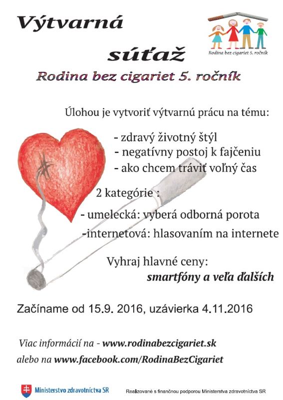 Občianske združenie Rodina a spoločnosť organizuje pre školský rok 2016/2017 ďalší ročník celoslovenskej umeleckej výtvarnej súťaže s názvom Rodina bez cigariet V. ročník.