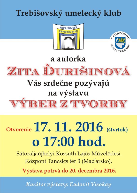 TUK a Zita Ďurišinová otvoria výstavu umeleckých diel s názvom Výber z tvorby 17.11.2016 v Kultúrnom centre Sátoraljaujhelyi Kossuth Lajós Muvelodesi Kozpont Tancsics tér 3 o 17.00 h.