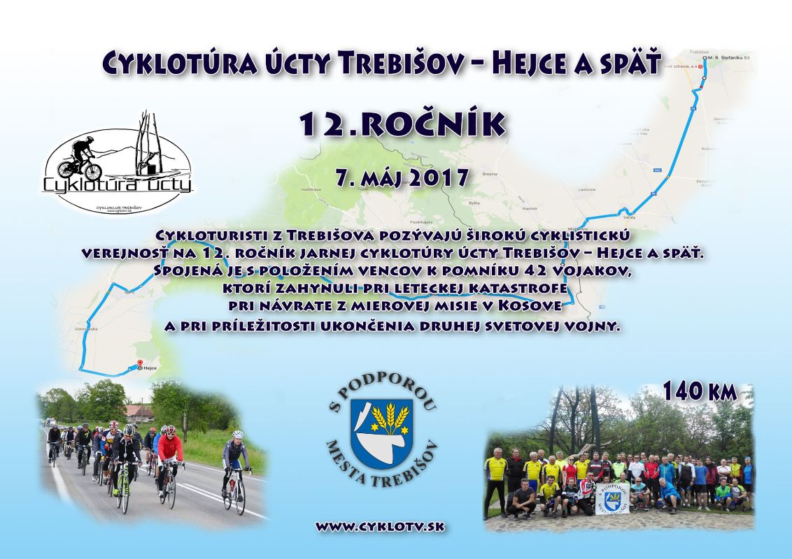 Cykloturisti z Trebišova organizujú pre širokú cyklistickú verejnosť 12. ročník jarnej cyklotúry úcty Trebišov – Hejce a späť. Cyklotúra bude spojená s položením vencov k pomníku 42 vojakov, ktorí zahynuli pri leteckej katastrofe počas návratu z mierovej misie v Kosove. Cyklotúra je zároveň venovaná aj spomienke na zosnulých vojakov pri príležitosti ukončenia druhej svetovej vojny. Na doterajších ročníkoch cyklotúry sa zúčastnilo 807 cyklistov.