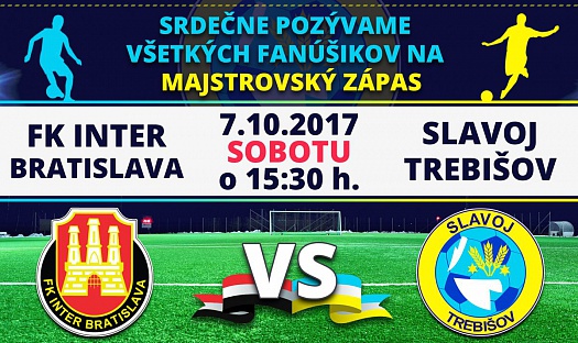 Mesto Trebišov pozýva na majstrovský zápas, ktorý sa uskutoční sobotu 7. októbra 2017 o 15.30 hod. medzi FK Inter Bratislava a Slavoj Trebišov na futbalovom štadióne v Stupave.