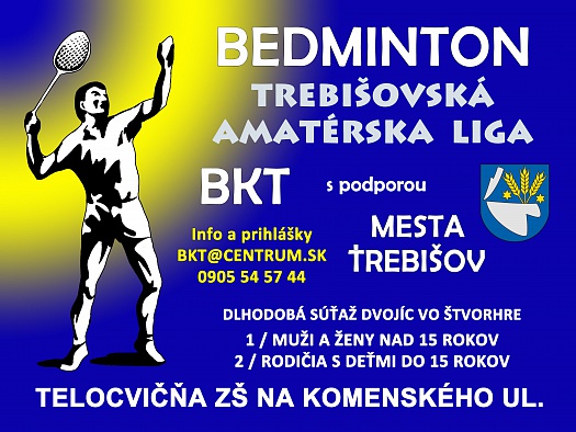 Bedminton BKT Trebišov a mesto Trebišov oznamuje, že v telocvični ZŠ na Komenského ulici sa pripravuje dlhodobá súťaž dvojíc na rovnakej výkonnostnej úrovni vo štvorhrách – Trebišovská amatérska liga v bedmintone.