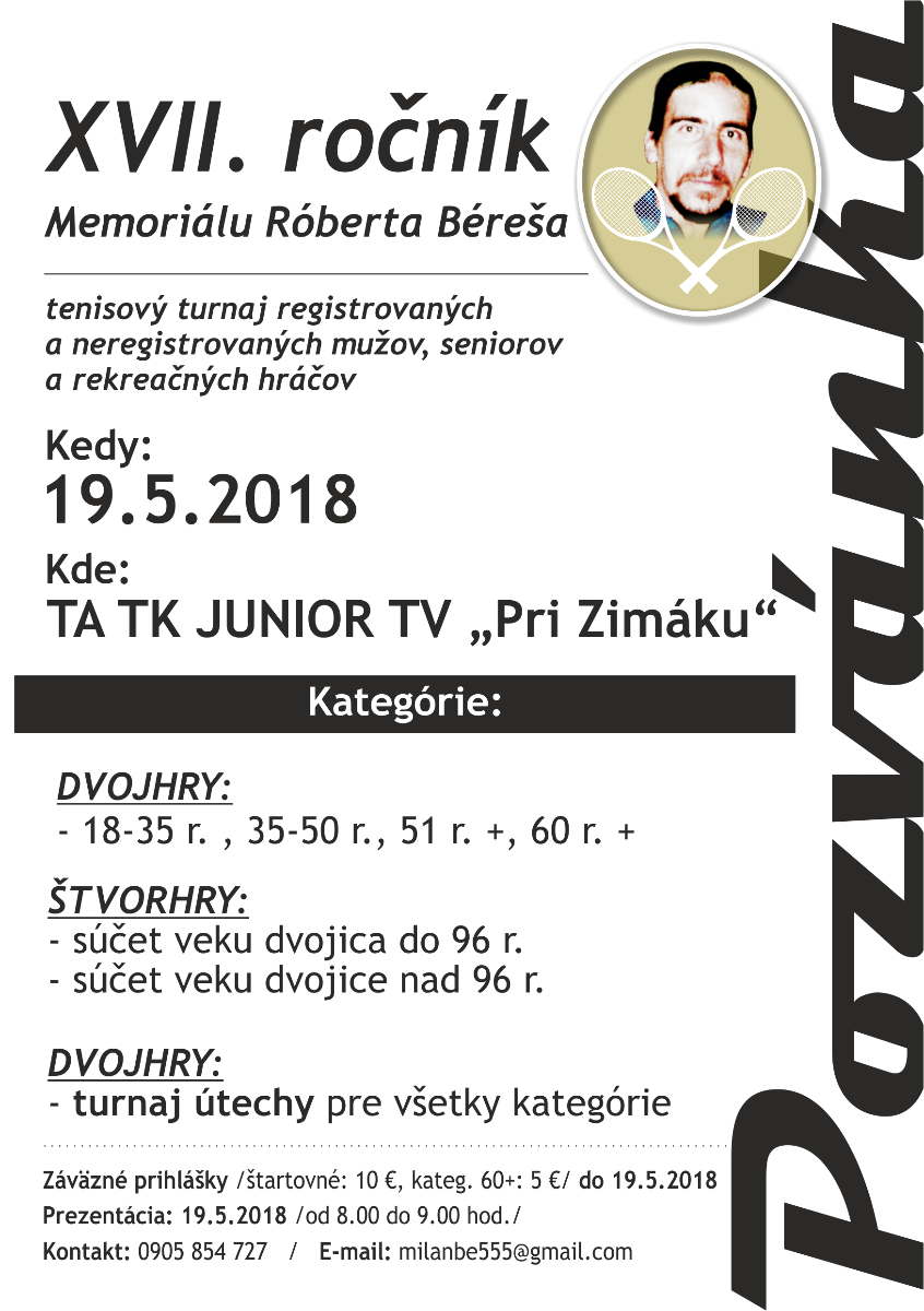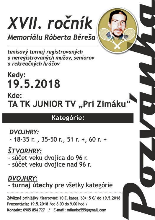 Tenisový klub Junior Trebišov organizuje sobotu 19. mája 2018 XVII. ročník Memoriálu Róberta Béreša v priestoroch TA TK Junior Trebišov (pri zimnom štadióne). Turnaj je určený registrovaným i neregistrovaným mužom, seniorov a rekreačných hráčov.