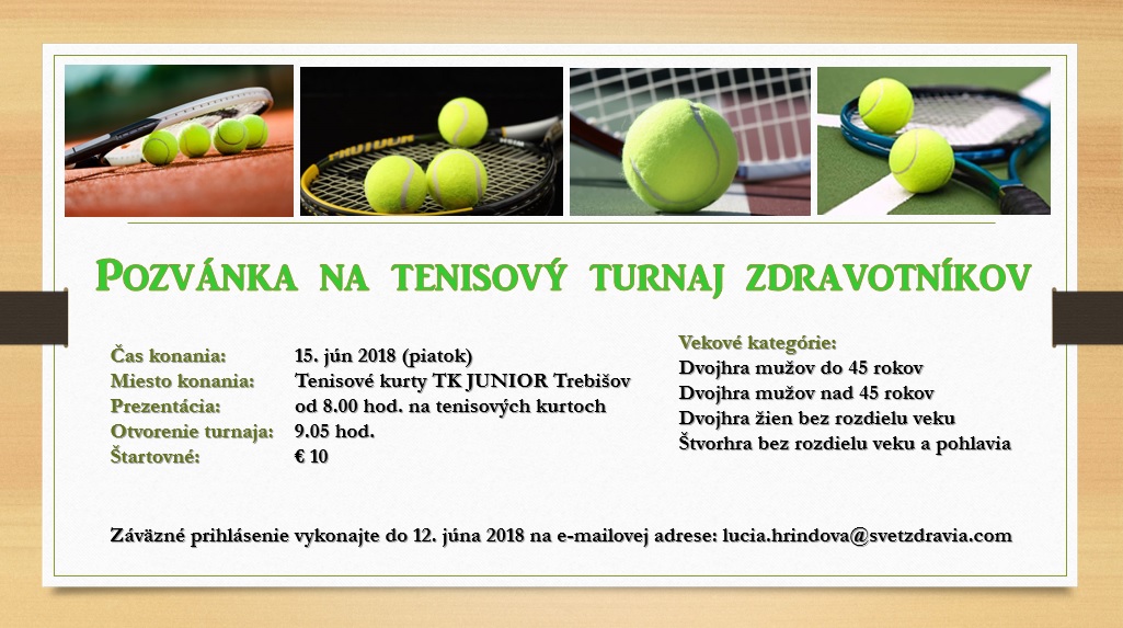Tenisový klub Junior Trebišov plánuje usporiadať Tenisový turnaj zdravotníkov piatok 15. júna 2018.
