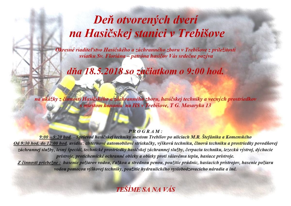 Okresné riaditeľstvo Hasičského a záchranného zboru v Trebišove organizuje piatok 18. mája 2018 so začiatkom o 9.00 hod., pri príležitosti sviatku sv. Floriána – patróna hasičov, Deň otvorených dverí.