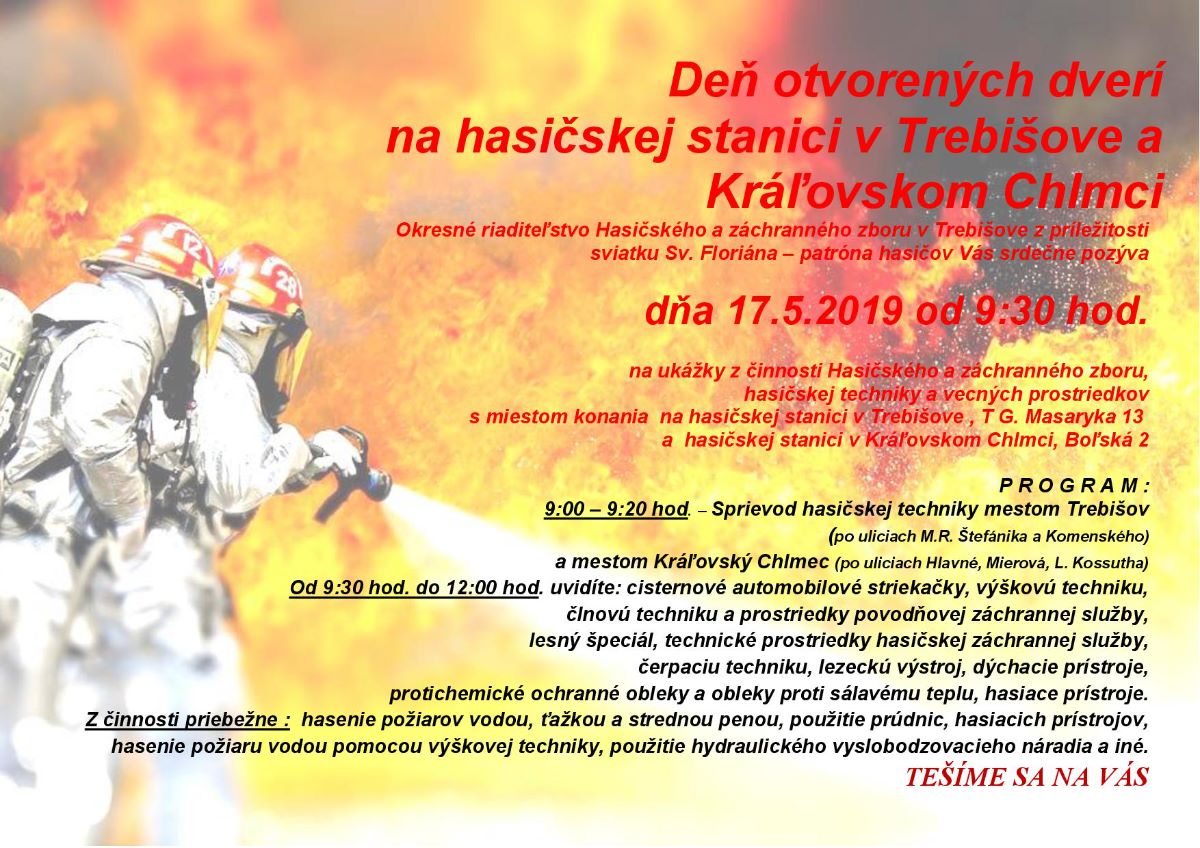Okresné riaditeľstvo Hasičského a záchranného zboru v Trebišove organizuje piatok 17. mája 2019 so začiatkom o 9.00 hod., pri príležitosti sviatku sv. Floriána – patróna hasičov, Deň otvorených dverí.