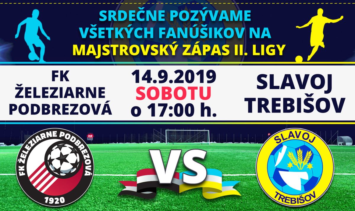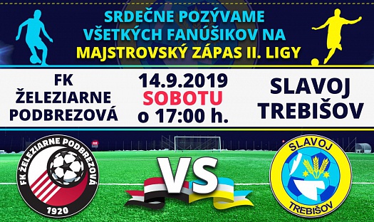 Majstrovský zápas II. ligy sa uskutoční sobotu 14. septembra 2019 so začiatkom o 17:00 hod. medzi FK ŽELEZIARNE Podbrezová - FK SLAVOJ Trebišov na ihrisku futbalového štadióna v Podbrezovej.