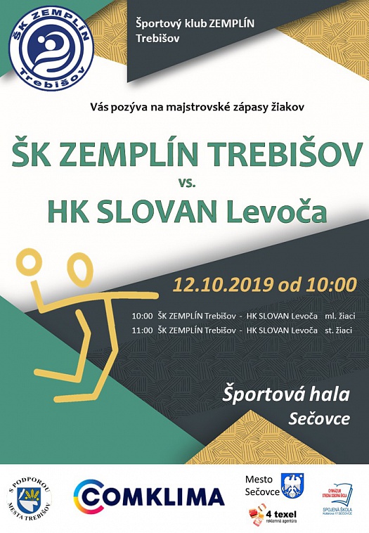 Sobotu 12. októbra 2019 sa uskutočnia majstrovské zápasy žiakov medzi ŠK Zemplín Trebišov a HK Slovan Levoča. Hádzanárske tímy odohrajú zápasy v Športovej hale v Sečovciach.