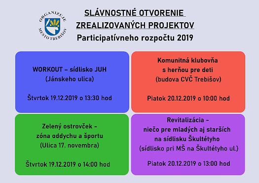 Mesto Trebišov pripravuje slávnostné otvorenia zrealizovaných projektov participatívneho rozpočtu 2019, ktoré sa uskutočnia koncom predvianočného týždňa - 19. a 20. decembra 2019.