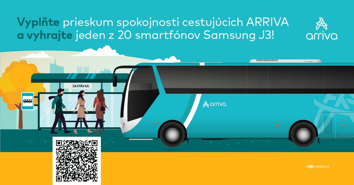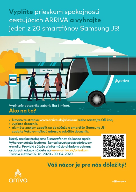 Každý respondent, ktorý vyplní dotazník, sa môže zároveň zapojiť do súťaže o smartfón. Dotazník prieskumu spokojnosti cestujúcich a pravidlá súťaže sú dostupné na webovej stránke www.arriva.sk/prieskum.