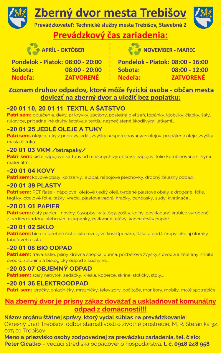 Vytriedený odpad je preto podstatné umiestniť do farebne rozlíšených kontajnerov alebo odovzdať na Zbernom dvore na Stavebnej ulici v Trebišove – areál Technických služieb mesta.