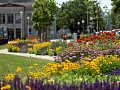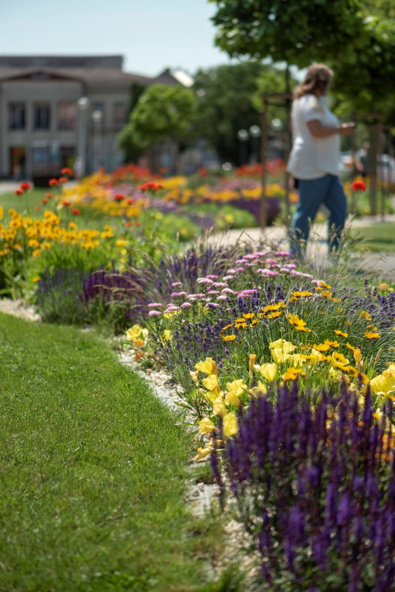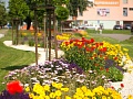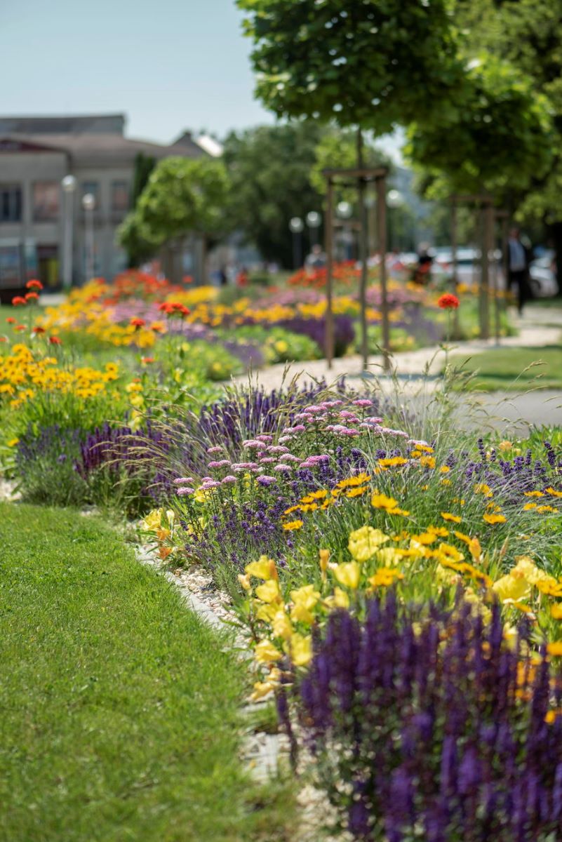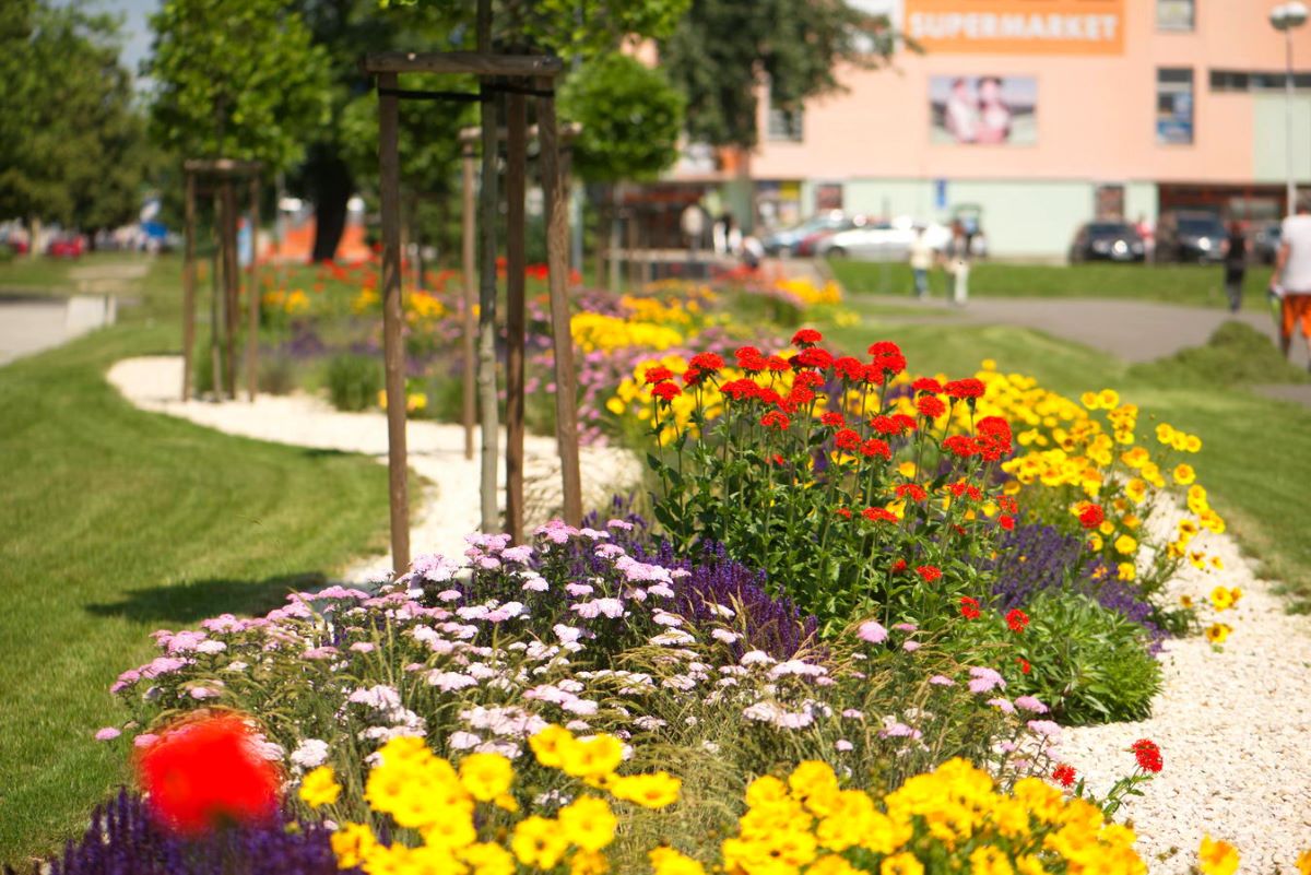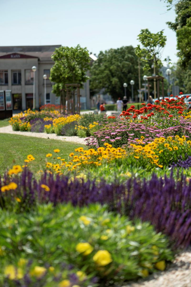 Rozkvitnutý záhon v centre Trebišova je pastvou pre oči