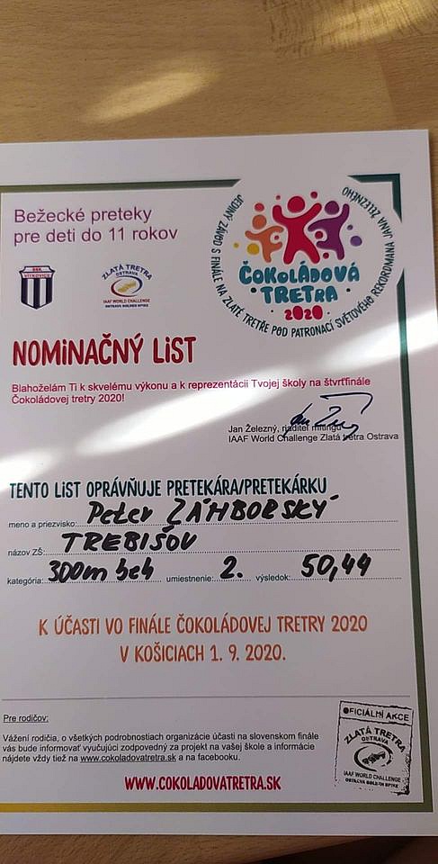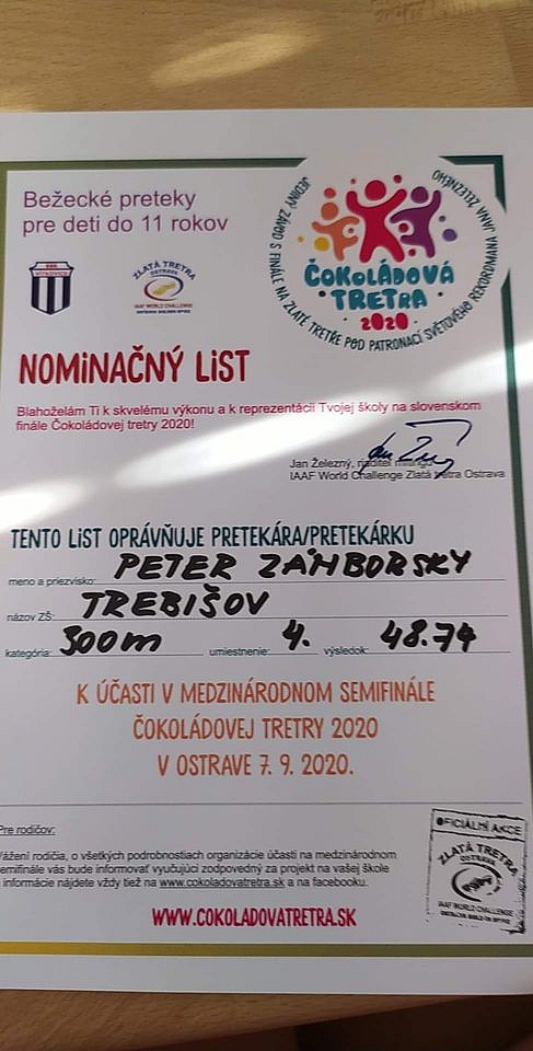 Vynikajúce bežecké výsledky a ocenenie bývalými a súčasnými hviezdami slovenskej atletiky si zaslúžil žiak ZŠ na Ul. M. R. Štefánika v Trebišove a multitalentovaného športovca Peter Zámborský. Za krátke obdobie žne jeden úspech za druhým a úspešne reprezentuje školu i naše mesto.