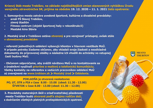 Krízový štáb mesta Trebišov, na základe najdôležitejších zmien stanovených vyhláškou Úradu verejného zdravotníctva SR, prijíma na obdobie 19. 12. 2020 – 11. 1. 2021 tieto opatrenia: