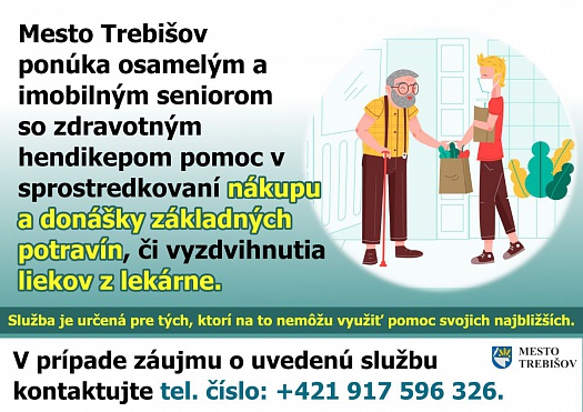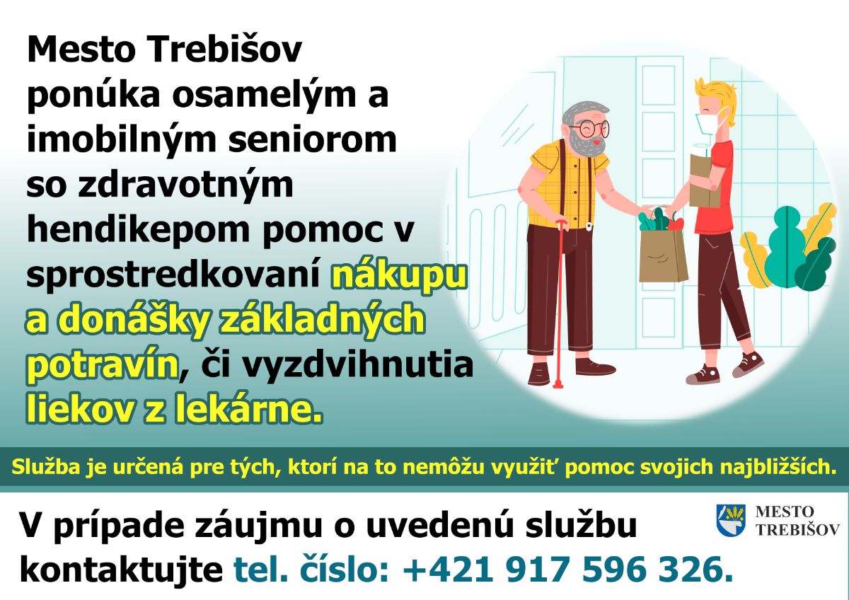 Z dôvodu zhoršenej epidemiologickej situácie na území mesta Trebišov a neustále vzrastajúceho počtu občanov s pozitívnymi testami na COVID19, mesto Trebišov opätovne ponúka osamelým a imobilným seniorom so zdravotným hendikepom, pomoc v sprostredkovaní nákupu a donášky základných potravín, či vyzdvihnutia liekov z lekárne.