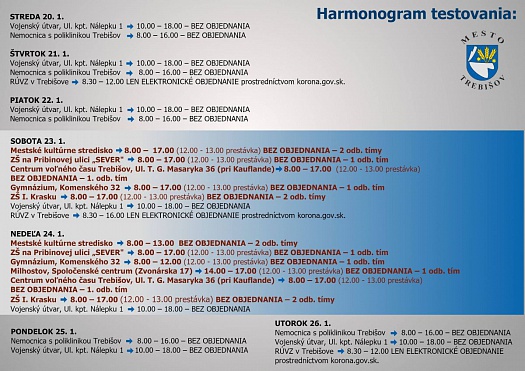 V týchto pracovných dňoch však môžu Trebišovčania, ako doposiaľ, využívať mobilné testovacie miesta zriadené Nemocnicou s poliklinikou v Trebišove, trebišovským vojenským útvarom a Regionálnym úradom verejného zdravotníctva so sídlom v Trebišove.