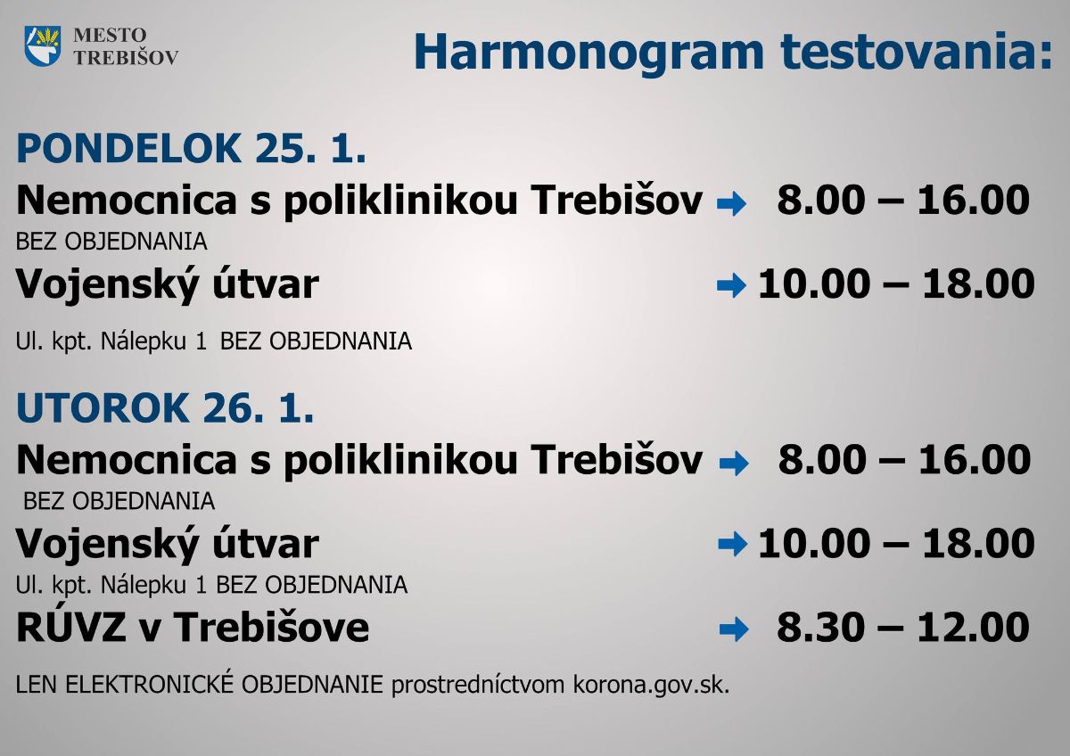 RÚVZ v Trebišove * 8.30 – 12.00 LEN ELEKTRONICKÉ OBJEDNANIE prostredníctvom korona.gov.sk.