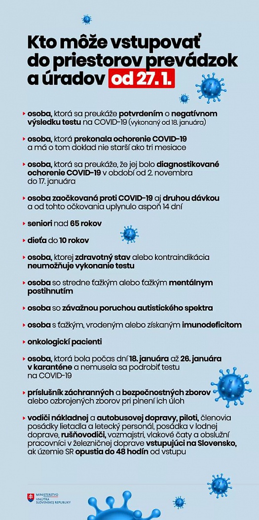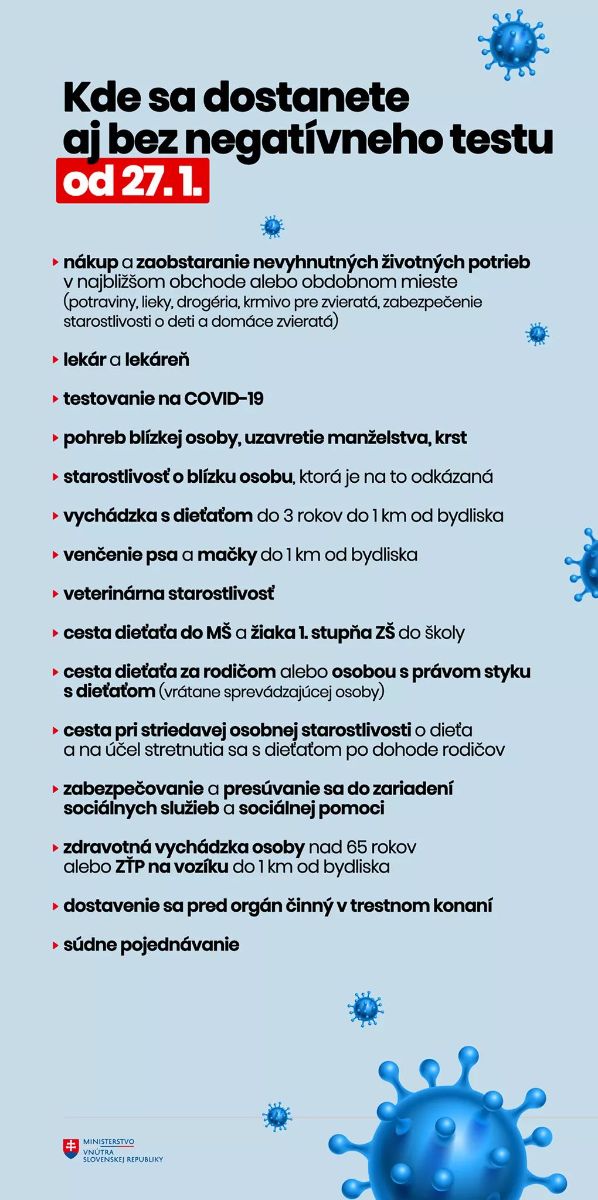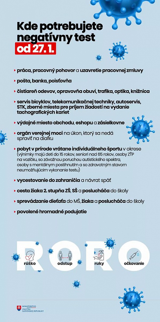 Zároveň pripomíname občanov mesta, že Úrad verejného zdravotníctva Slovenskej republiky vydal vyhlášku, ktorá určuje, kde bude od stredy 27. januára potrebný negatívny test a kde naopak môžeme ísť aj bez neho.