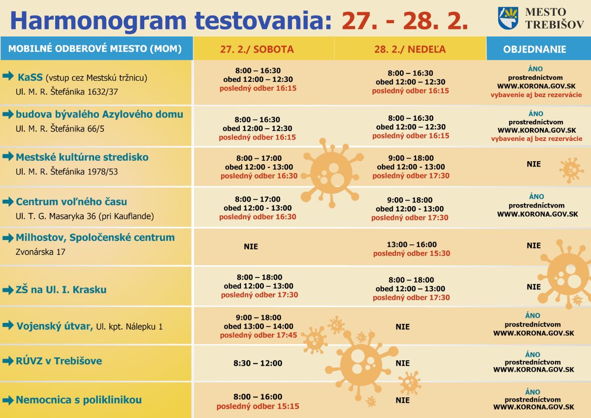 Nadchádzajúci víkend (27. - 28. 2.) mesto navýši počet MOM-iek v Trebišove. Antigénové testovanie bude prebiehať na deviatich stanovištiach.