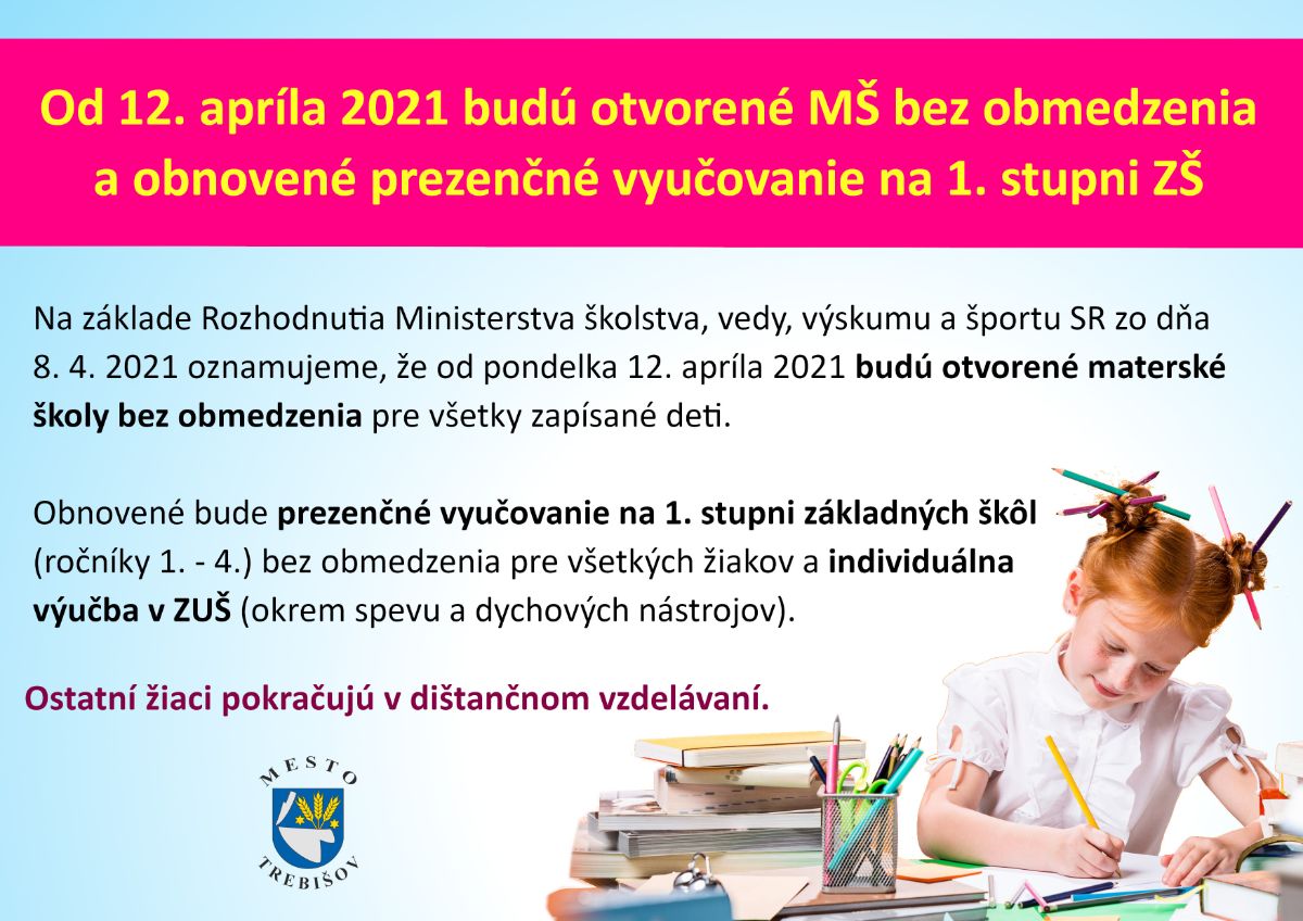 Na základe Rozhodnutia Ministerstva školstva, vedy výskumu a športu SR č.2021/11929:1-A1810 zo dňa 8. 4. 2021 oznamujeme, že od pondelka 12. apríla 2021 budú otvorené materské školy bez obmedzenia pre všetky zapísané deti.