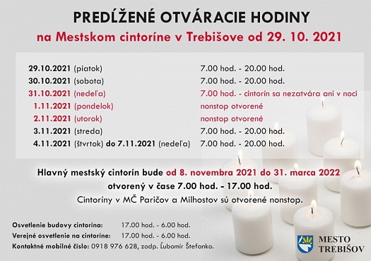 Predĺžené otváracie hodiny na Mestskom cintoríne v Trebišove od 29. 10. 2021 (piatok)