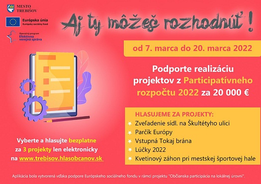 Na webovej stránke www.trebisov.hlasobcanov.sk - Všetky projekty (hlasobcanov.sk) sa o hlasy uchádza 5 zaujímavých projektov. Najúspešnejšie z nich, teda tie s najvyšším počtom hlasov, budú podporené celkovou sumou 20.000 € z participatívneho rozpočtu mesta na rok 2022.