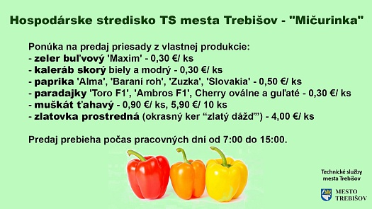 V skleníku mestského hospodárskeho strediska („Mičurinka“) sú zeleninové priesady určené na predaj. Z jeho vlastnej produkcie si môžete vybrať: