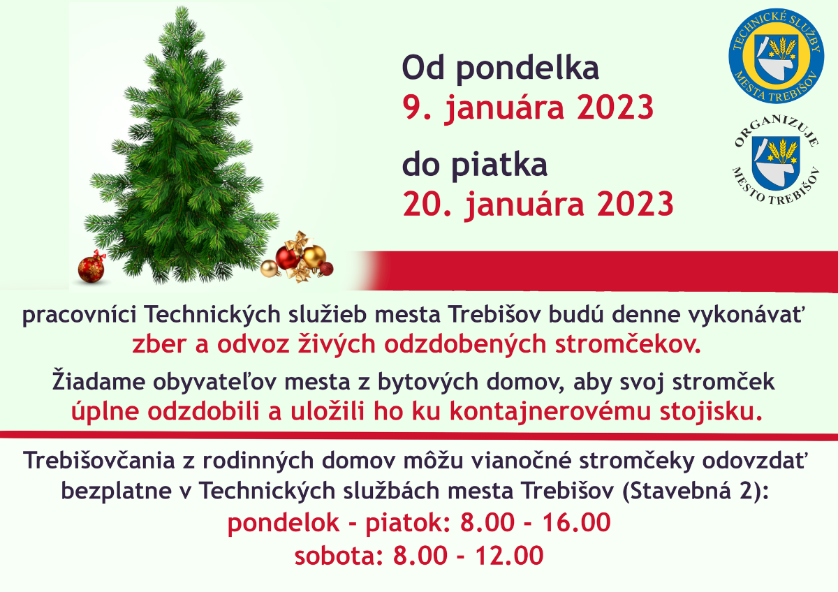 Od pondelka 9. januára 2023 do piatka 20. januára 2023 pracovníci Technických služieb mesta Trebišov budú denne vykonávať zber a odvoz živých a LEN odzdobených stromčekov.