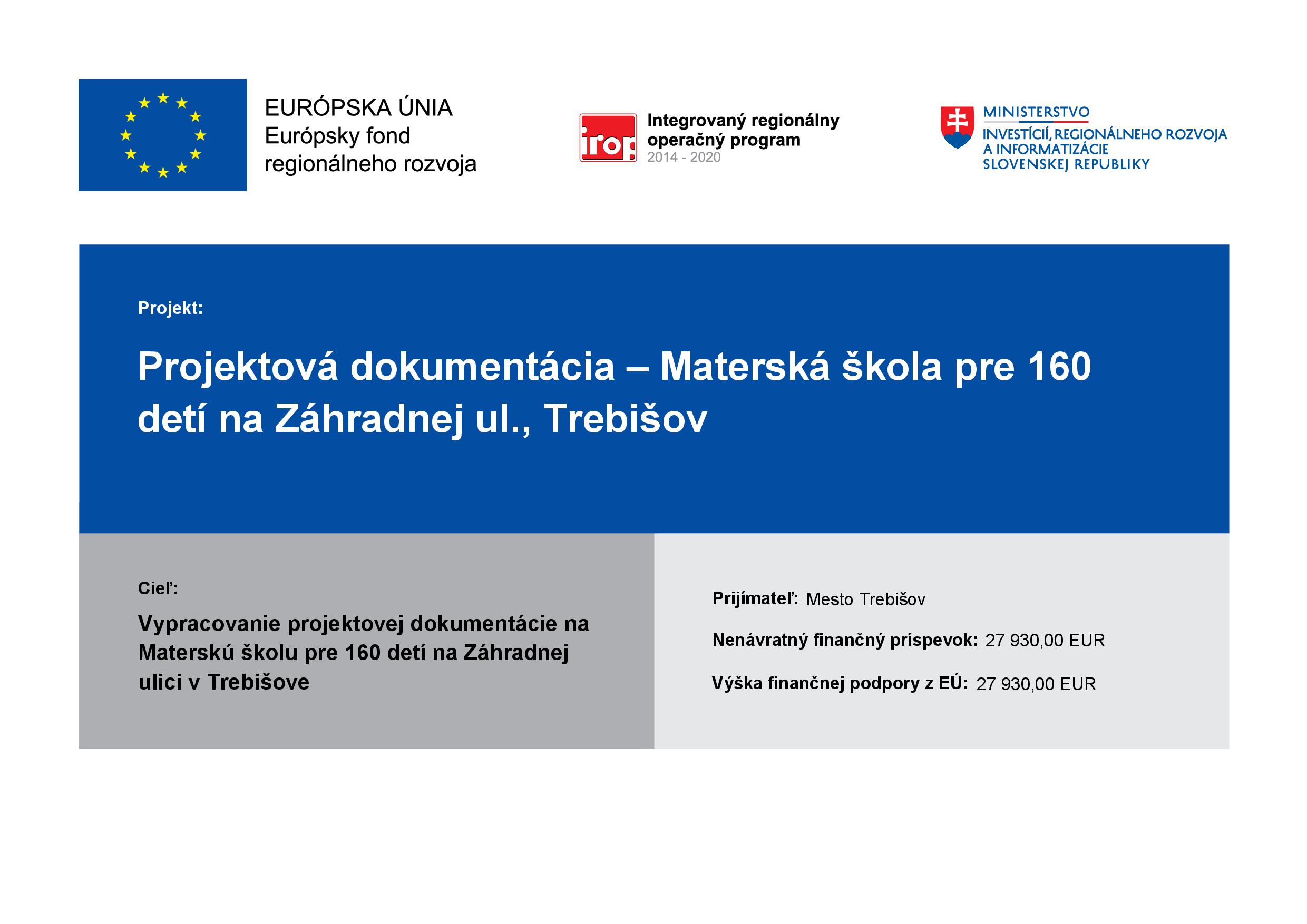 Názov projektu: Projektová dokumentácia – Materská škola pre 160 detí na Záhradnej ul., Trebišov