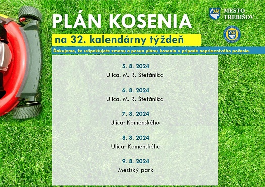 V priebehu týždňa od 5. do 9. augusta 2024 je plánované kosenie trávnatých porastov v týchto oblastiach mesta: