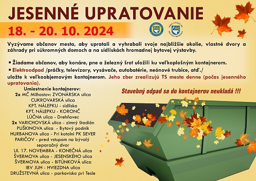 Počas jesenného upratovania budú Technické služby realizovať denný zber odpadu z veľkokapacitných kontajnerov, ktoré budú umiestnené na území mesta.