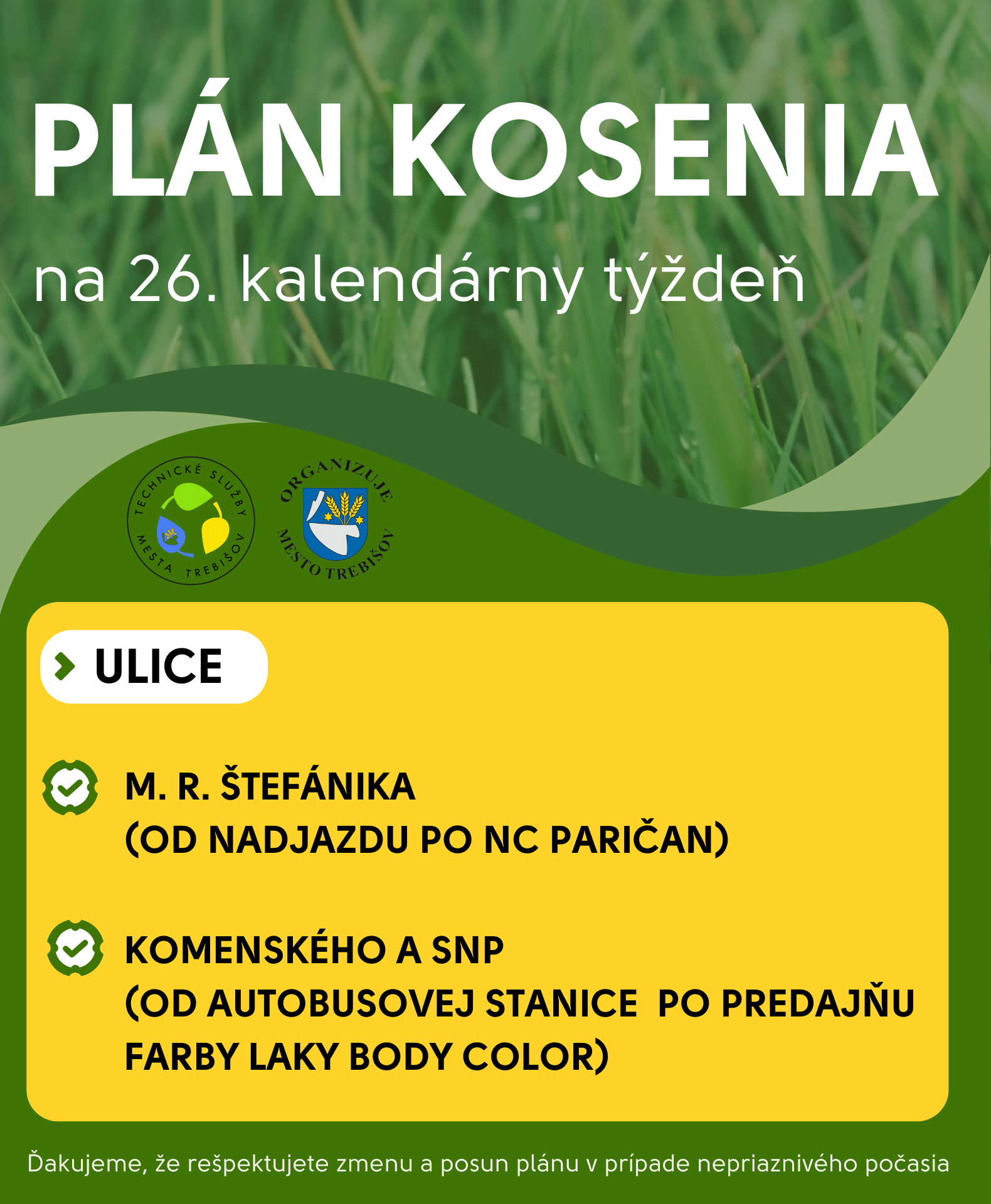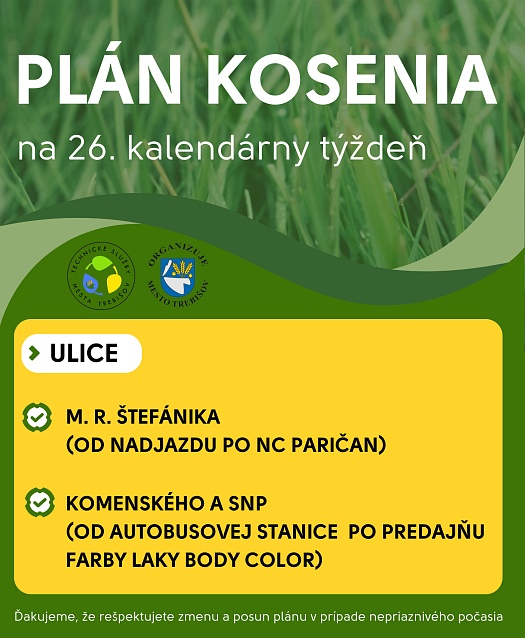 V aktuálnom týždni prebieha kosenie v týchto uliciach mesta.