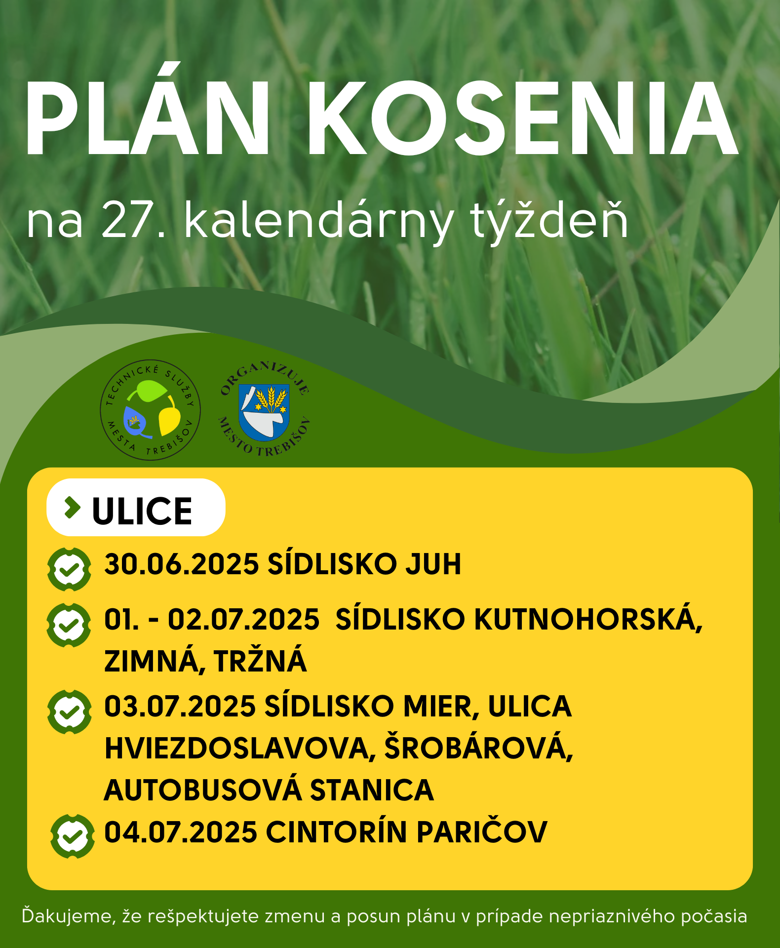 V aktuálnom týždni prebieha kosenie v týchto uliciach mesta.