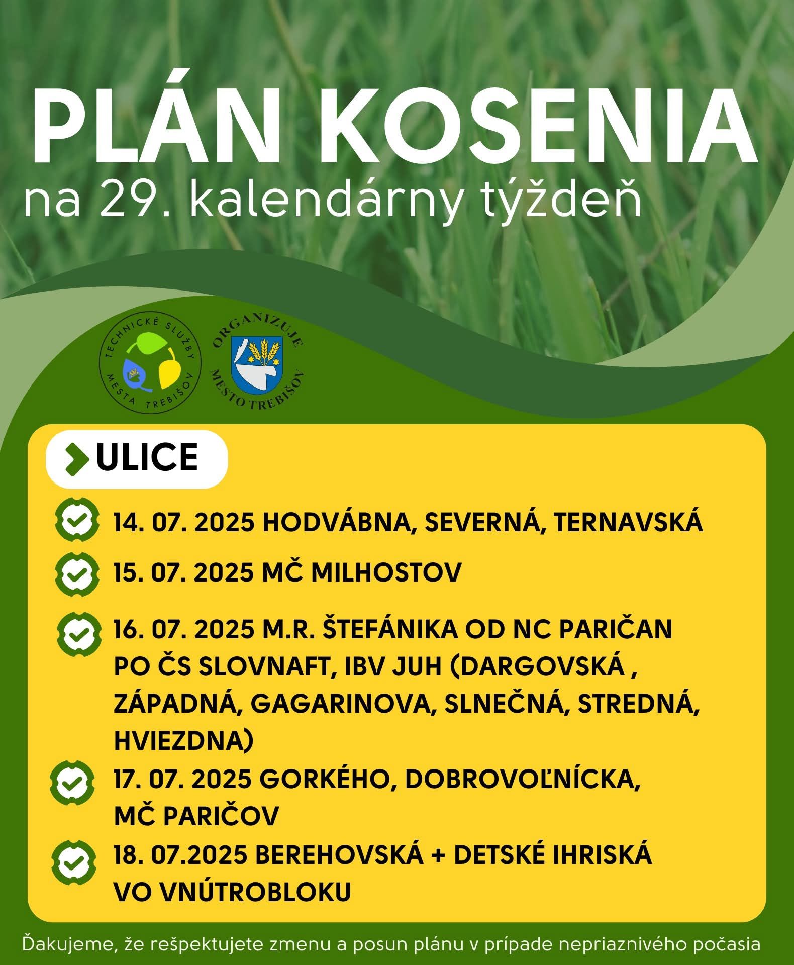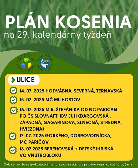 V aktuálnom týždni prebieha kosenie v týchto uliciach mesta.