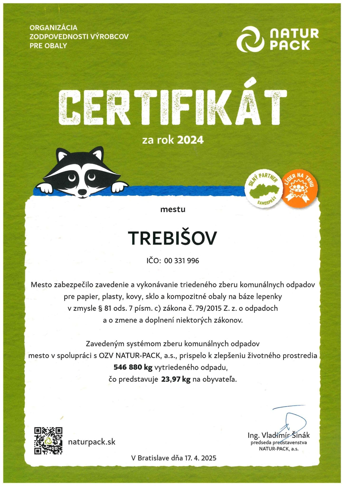 V roku 2024 sa nám takto spoločne podarilo vytriediť 546 880 kg odpadu, čo predstavuje 23,97 kg na obyvateľa.