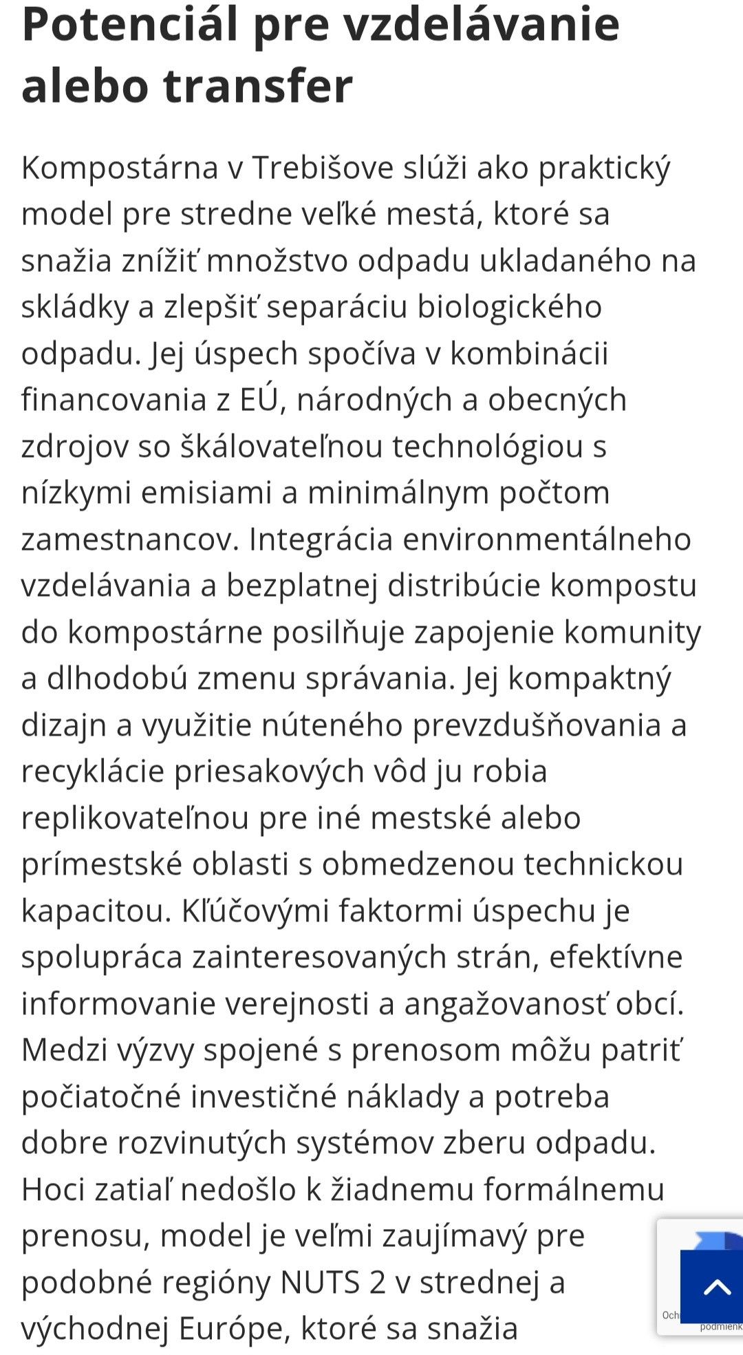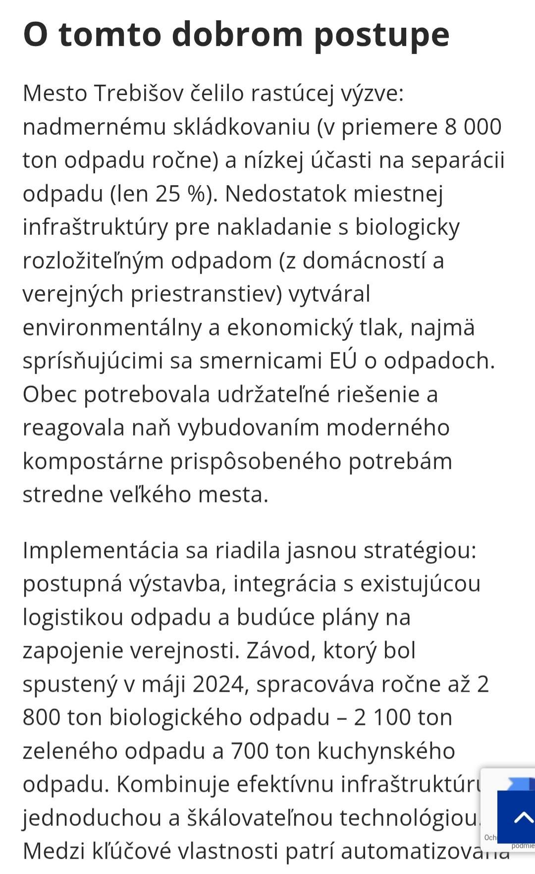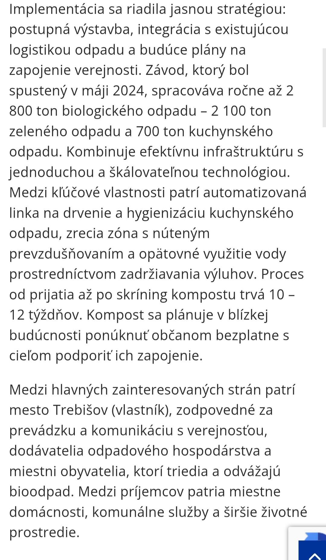 „... Kompostáreň v Trebišove slúži ako praktický model pre stredne veľké mestá, ktoré sa snažia znížiť množstvo odpadu ukladaného na skládky a zlepšiť separáciu jeho biologickej zložky. Jej úspech spočíva v kombinácii financovania z EÚ, národných a obecných zdrojov so škálovateľnou technológiou s nízkymi emisiami a minimálnym počtom zamestnancov... .“