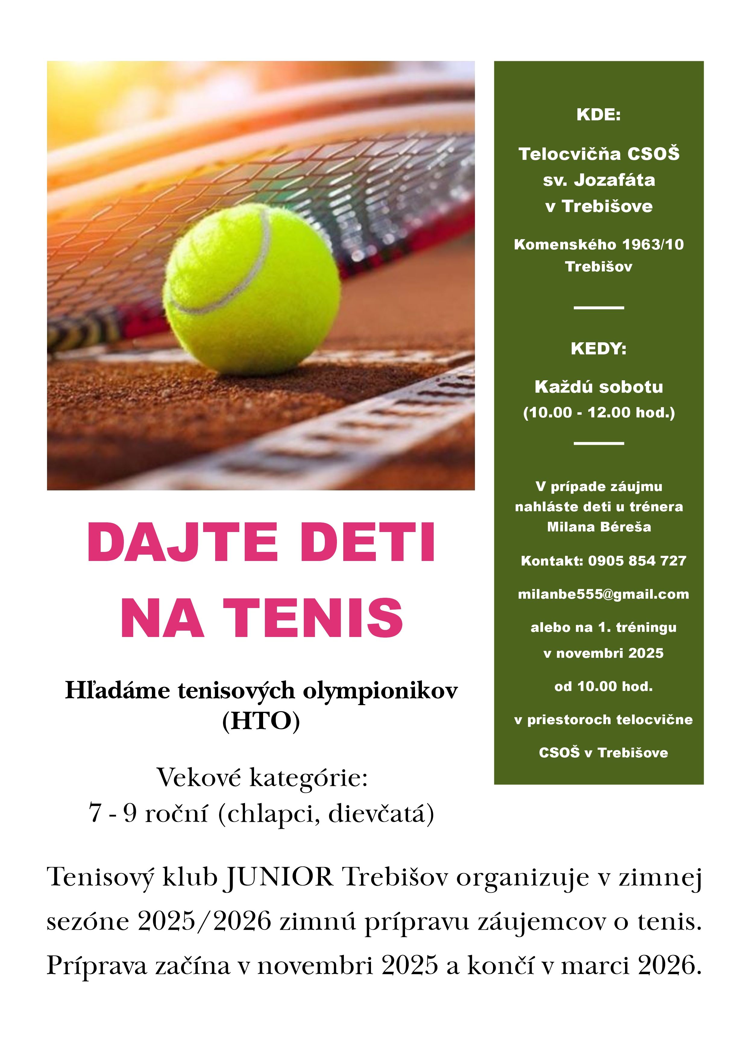 Tenisový klub JUNIOR Trebišov spúšťa zimnú prípravu pre deti vo veku 7 až 9 rokov (chlapci aj dievčatá), ktoré chcú objaviť radosť z tenisu, získať pohybové základy a možno raz zažiariť aj na svetových kurtoch.