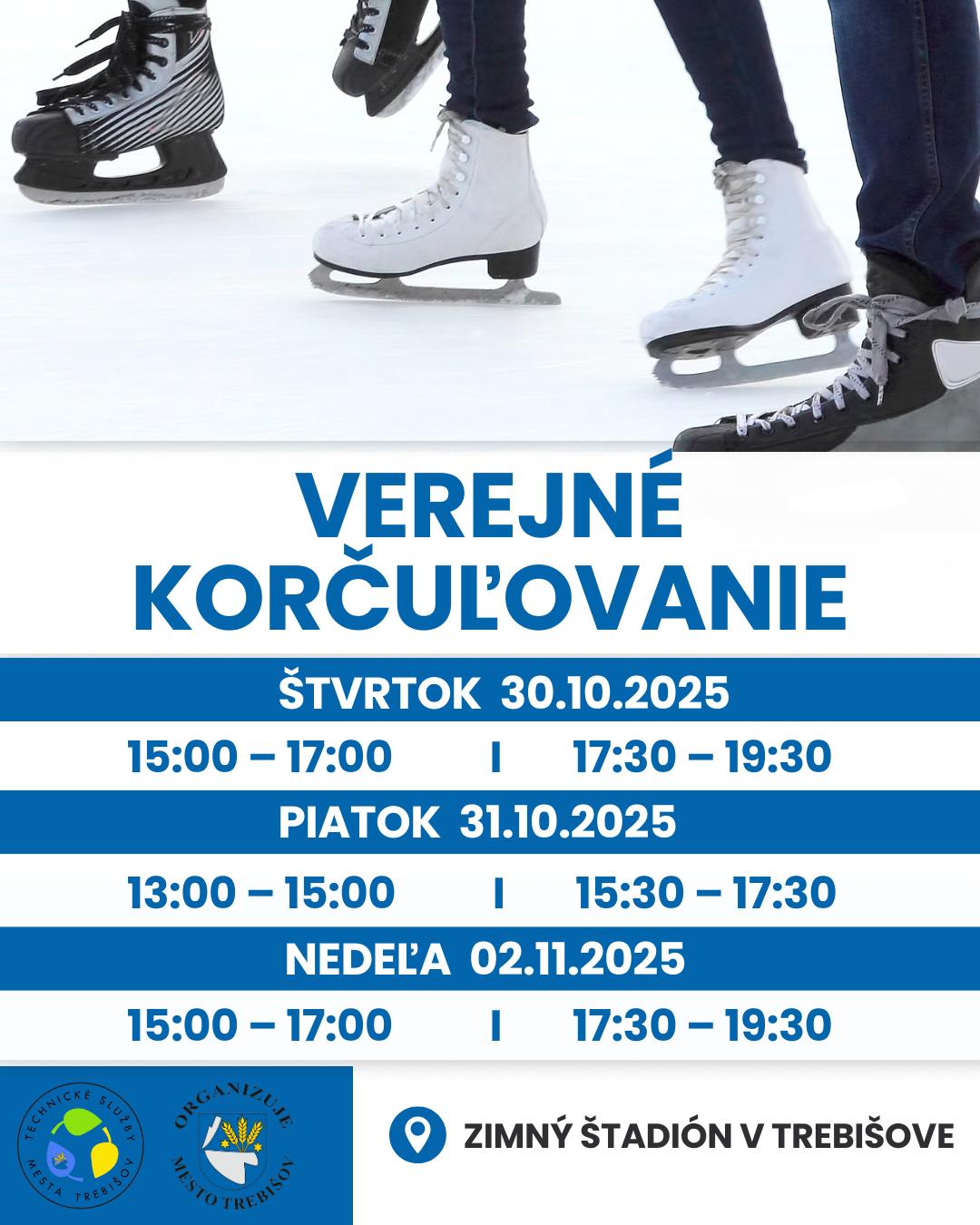 Ľadová plocha zimného štadióna je pre vás pripravená v uvedených časoch.