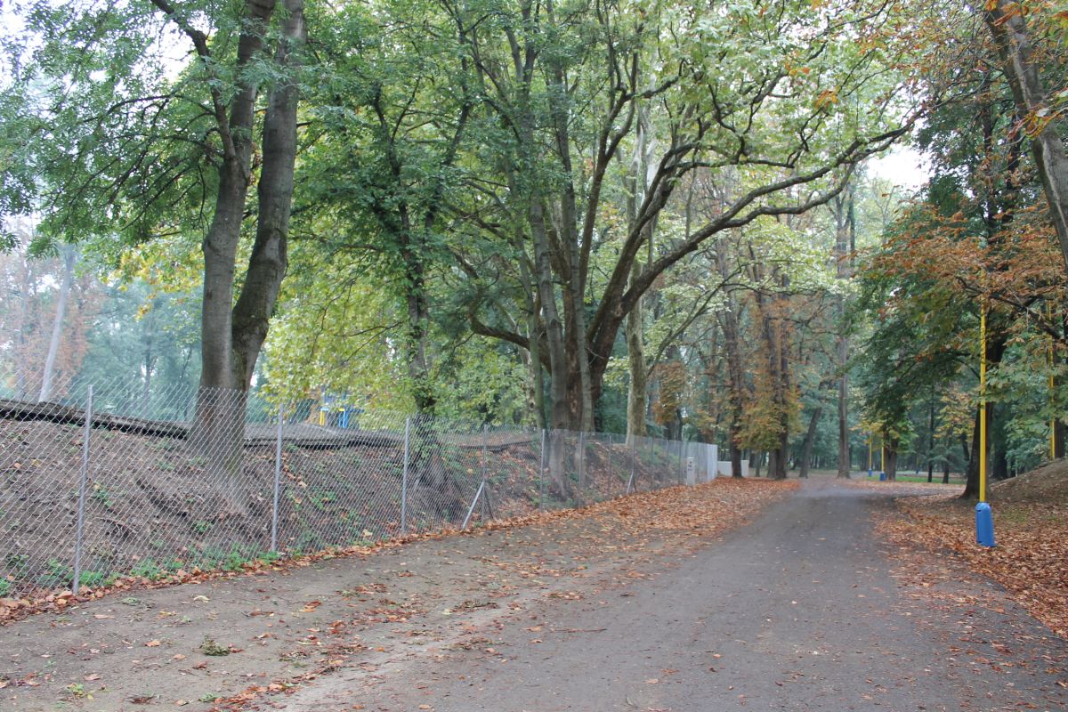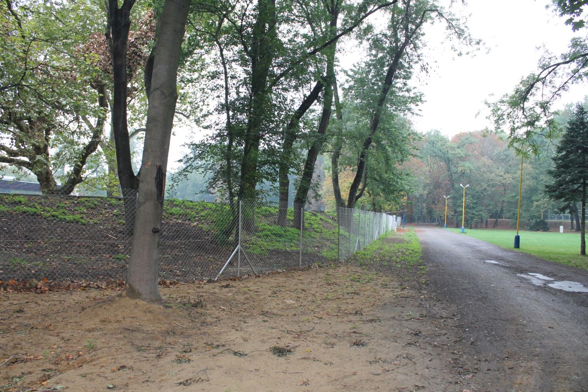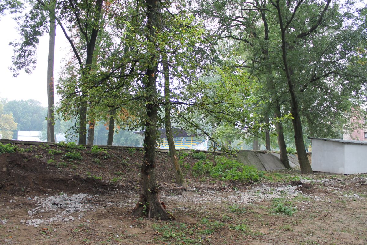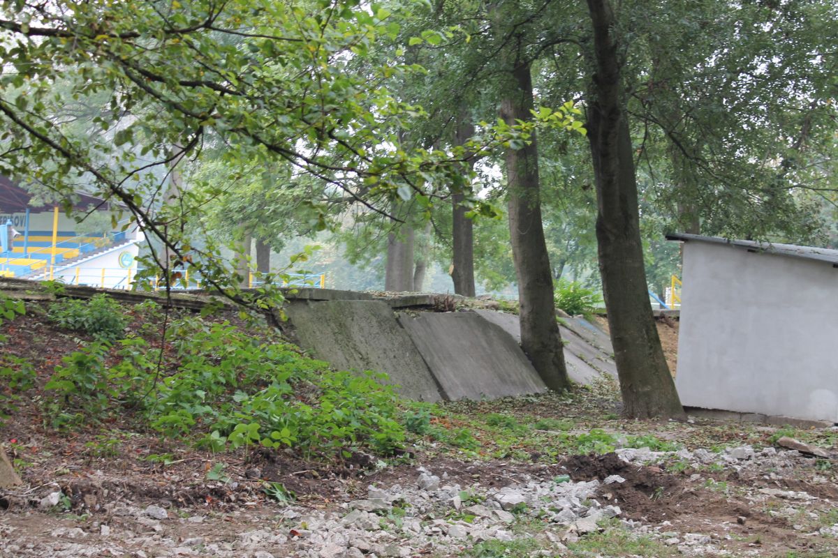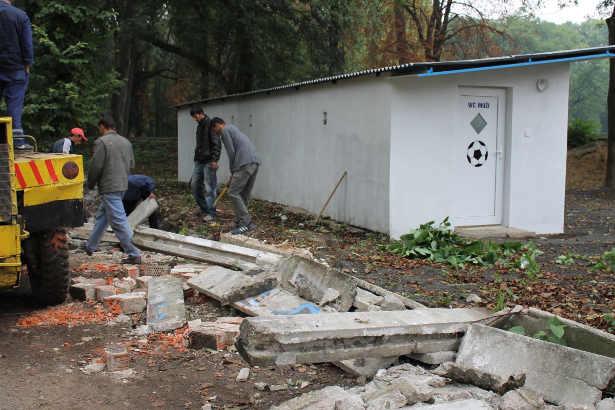 Demontáž betónového plota okolo futbalového ihriska v parku