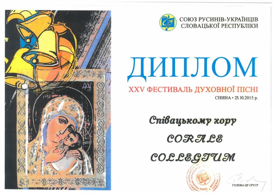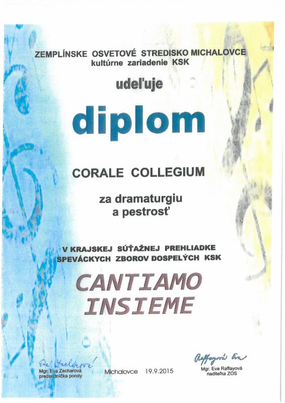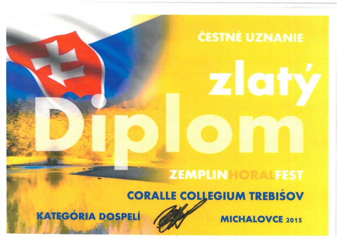 S podporou mesta Trebišov sa zbor Corale Colegium veľmi úspešne prezentoval na XXV. ročníku jubilejného Medzinárodného festivalu duchovnej piesne v Snine (25. október 2015) a tiež na Medzinárodnom festivale zborového spevu „Zemplín Choral Fest - 1. ročník“. Toto súťažné podujatie sa uskutočnilo 30. októbra 2015 v Michalovciach. Zbor si odtiaľ odniesol „zlatý diplom“. Zúčastnili sa na ňom spevácke zoskupenia zo Slovenska, Ukrajiny, Bieloruska, Slovinska a Bulharska.