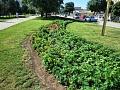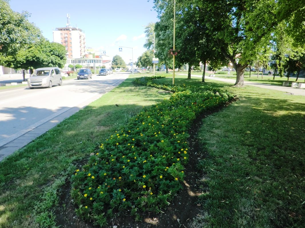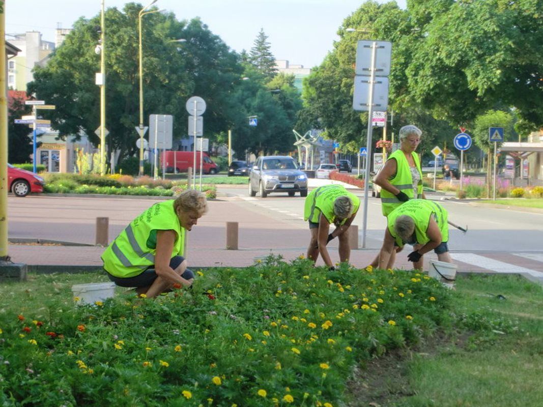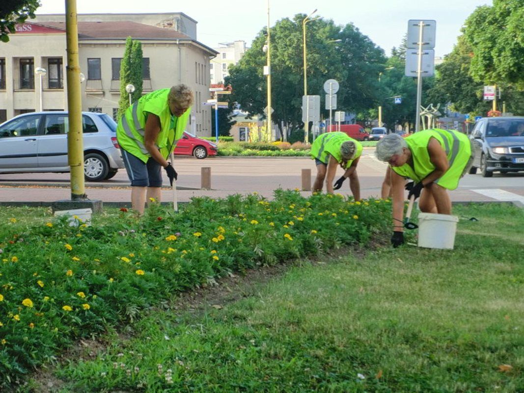 Pracovníci Mestského hospodárskeho strediska ošetrujú kvetinový záhon odstraňovaním buriny.