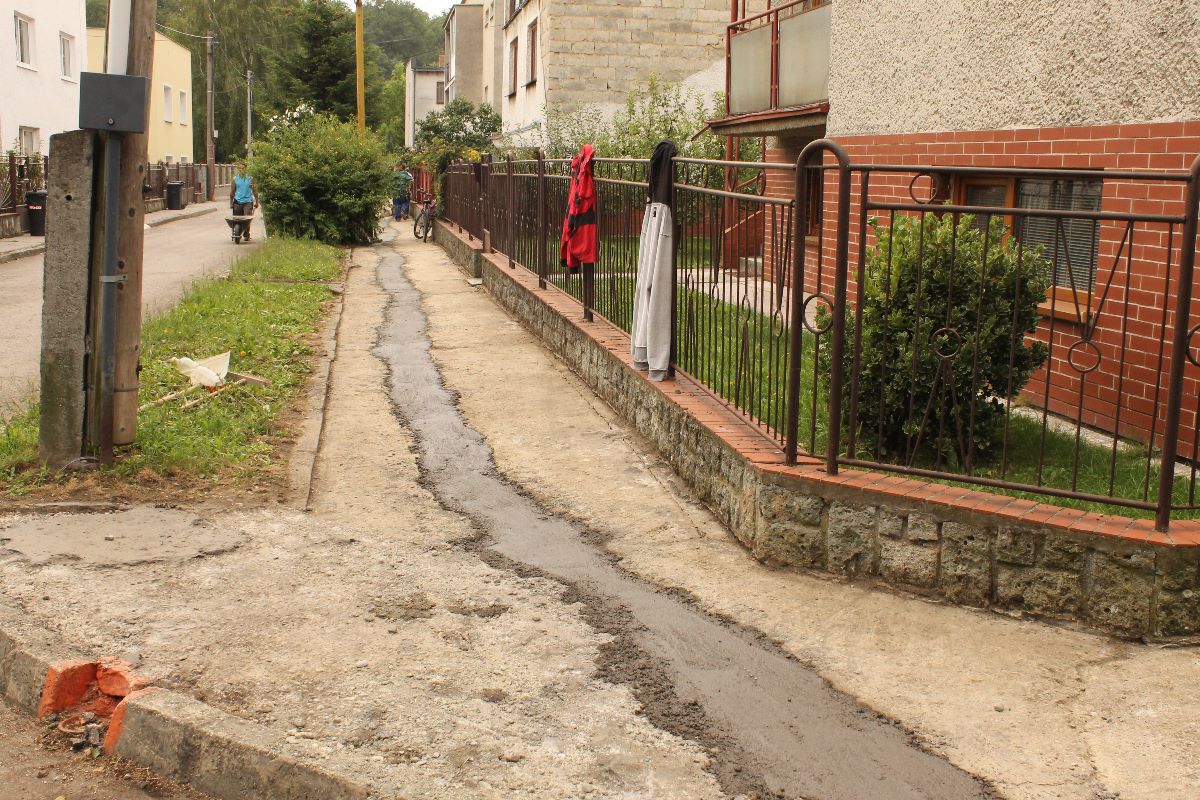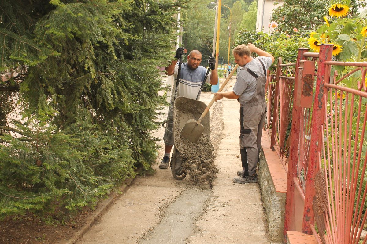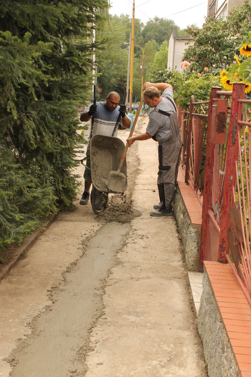 Pracovníci stavebnej skupiny mesta a pracovná skupina pod vedením Ing. J. Kereštana piatok 20. júla betónovaním vyrovnali prepadnutú časť chodníka na Palárikovej ulici. Na fotografiách zaznamenaný chodník bude v najbližších dňoch podliehať oprave položením nového asfaltu.