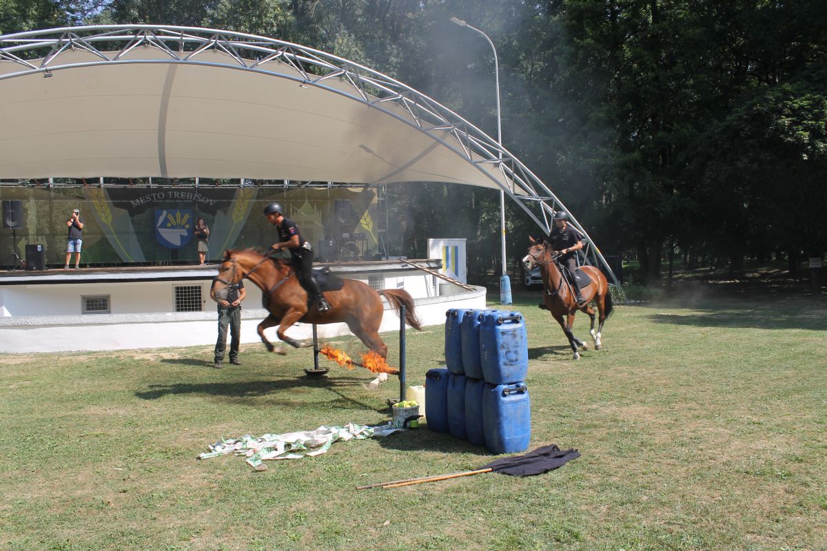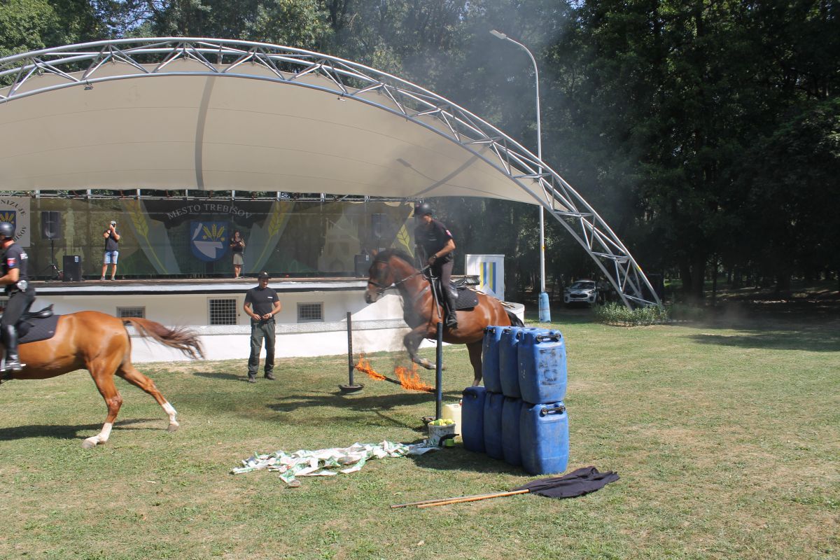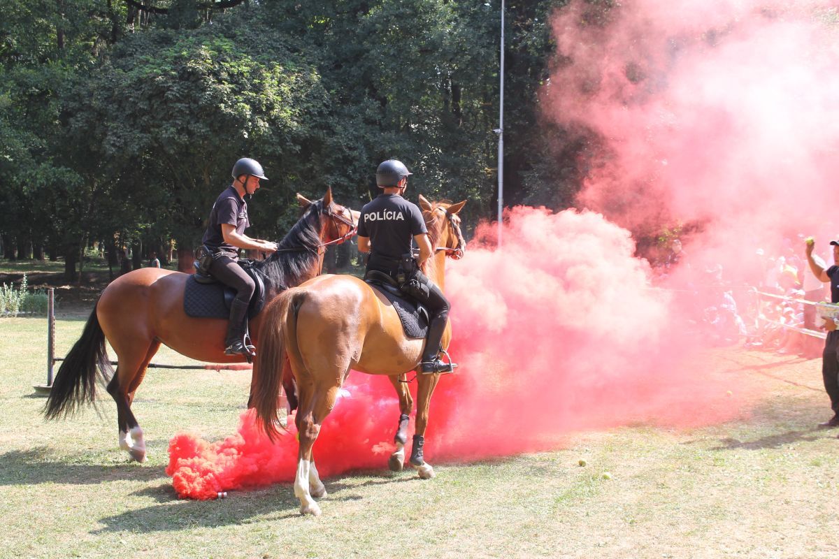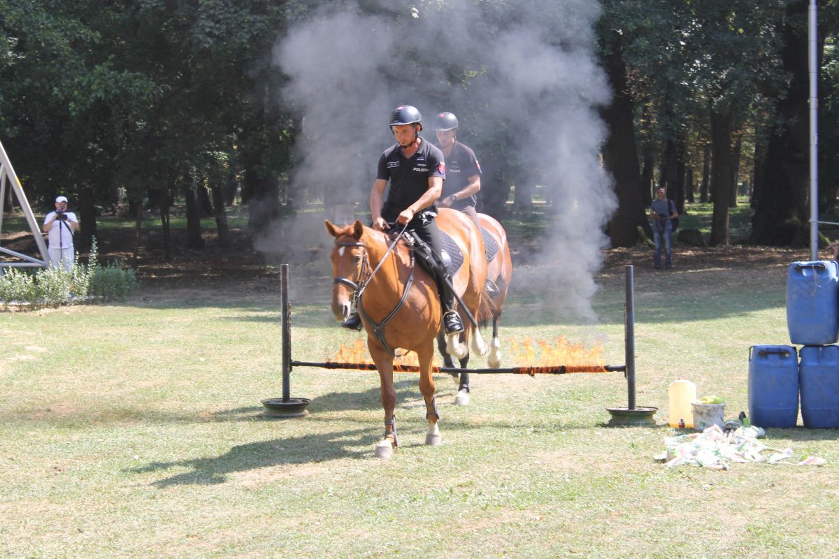 - výcviku služobných koní odd. jazdnej polície v Košiciach, v rámci ktorých bol odprezentovaný pozdrav na koni, práca s vlajkou, sprievod, skok cez oheň, prechod cez znížený podhľad.
