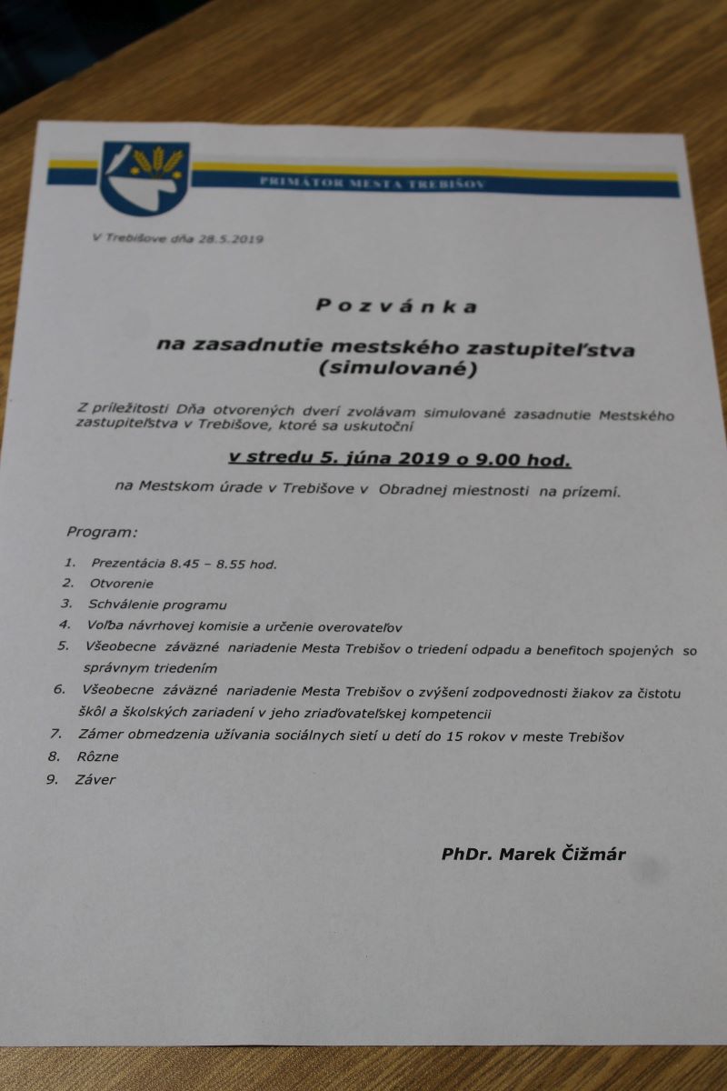 Pre žiakov bol pripravený každým rokom viac obľúbený program, v rámci ktorého si vyskúšali pozíciu komunálnych poslancov počas simulovaného zasadnutia mestského zastupiteľstva. Prítomní žiaci rokovali, hlasovali, zapájali sa do diskusií, reagovali na faktické poznámky.
