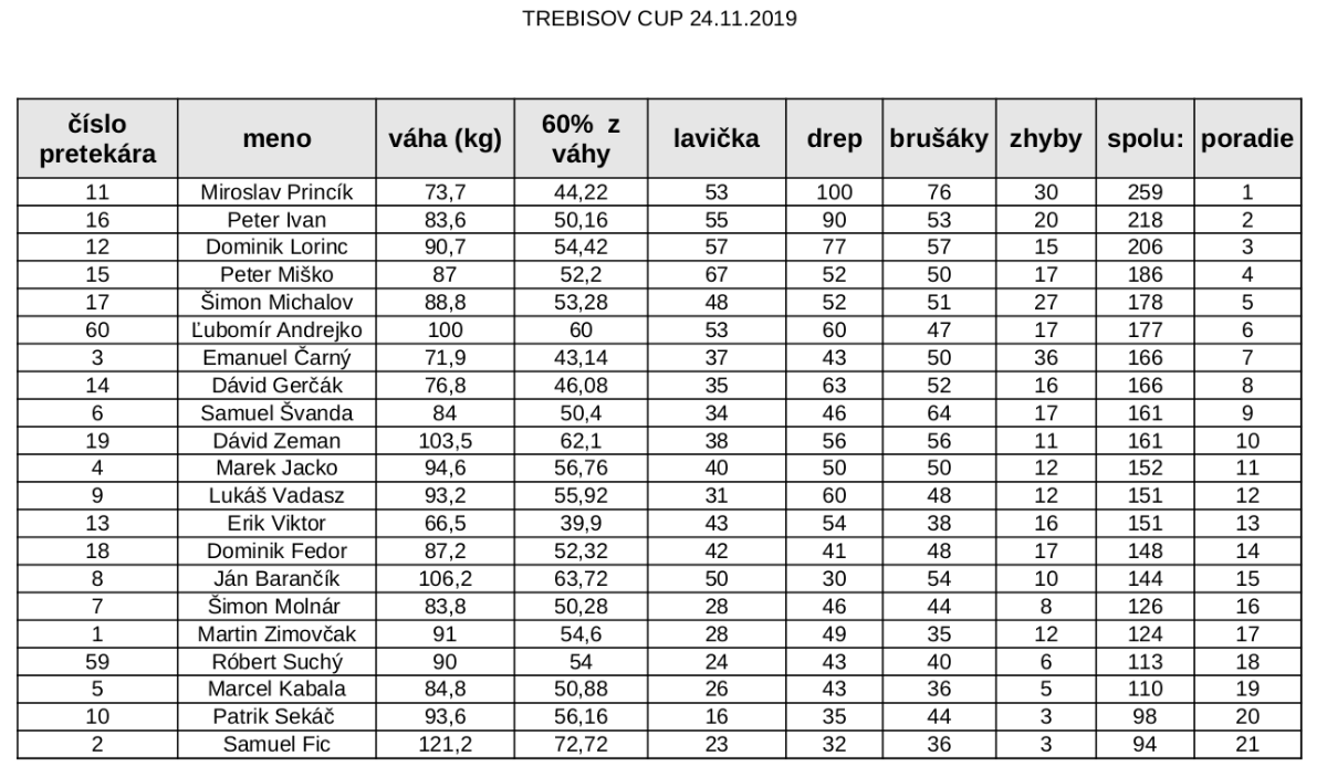 Do nedeľňajšieho (24. 11.) športového podujatia sa zapojilo 21 registrovaných súťažiacich a vytvoriť dobrú atmosféru prišlo do Športovej haly v Trebišove niekoľko desiatok priaznivcov spomedzi širokej verejnosti.