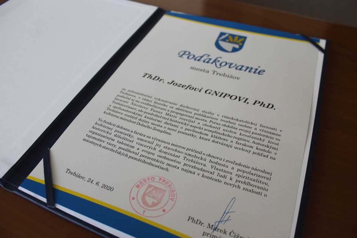 V rámci poďakovania primátor ocenil dekanovu aktívnu publikačnú činnosť o pavlínskom kláštore a farskom kostole, ktorá sa stala dôležitým príspevkom v poznávaní dejín nášho mesta a dotváraní uceleného pohľadu na kultúrnu minulosť Dolného Zemplína. Publikáciami, ktoré dr. Jozef Gnip napísal počas svojej duchovnej služby v Trebišove, sa osobne podieľal na zviditeľňovaní a propagovaní mesta.