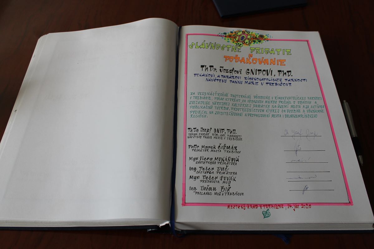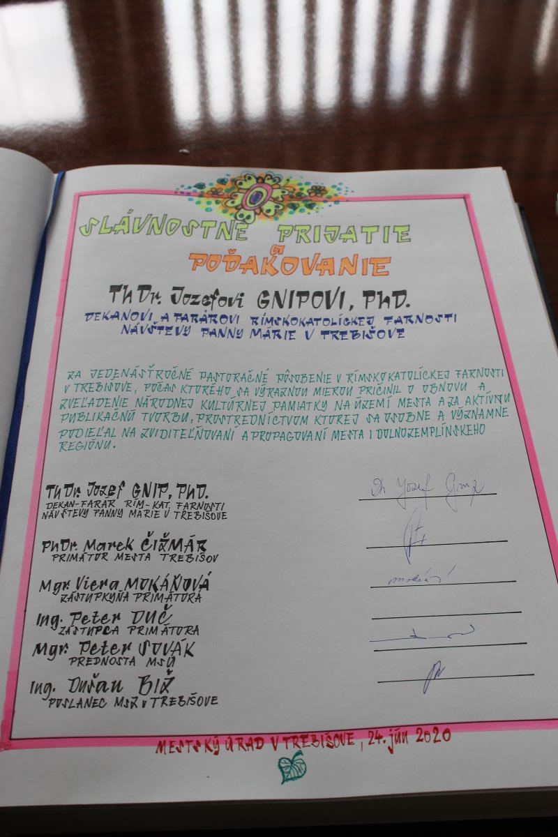 Pri príležitosti ukončenia pôsobenia na pozícii dekana a farára Rímskokatolíckej farnosti Návštevy Panny Márie v Trebišove primátor mesta Trebišov PhD. Marek Čižmár spolu so svojou zástupkyňou Mgr. Vierou Mokáňovou, prednostom MsÚ Mgr. Petrom Sovákom a poslancom MsZ Ing. Dušanom Bižom slávnostne prijali dekana rímskokatolíckej farnosti ThDr. Jozefa Gnipa, PhD. a poďakovali sa mu za jeho jedenásťročnú pastoračnú službu v trebišovskej farnosti, počas ktorej sa výraznou mierou pričinil aj o obnovu a zveľadenie národnej kultúrnej pamiatky na území mesta - farského kostola Návštevy Panny Márie. Prostredníctvom viacerých úspešných projektov umocnil stavebno-umeleckú hodnotu kostola.