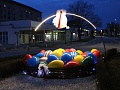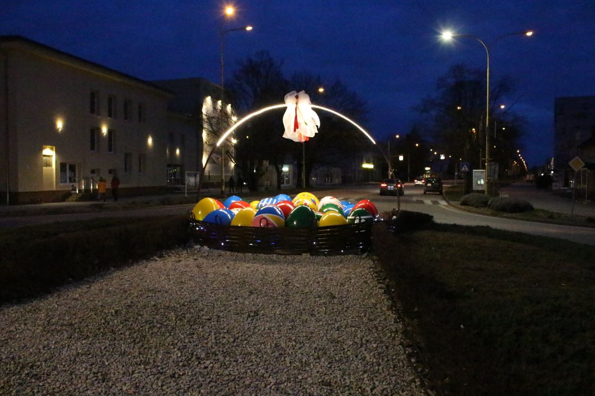 Veľkonočná výzdoba na okružnej križovatke v blízkosti zmodernizovanej KaSS púta pozornosť už z pomerne veľkej diaľky.